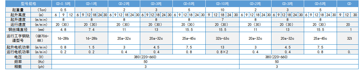 | 起升高度 | m | 6 | 9 | 12 | 16 | 24 | 32 | 8 | 10 | 16 | 20 | 6 | 8 | 12 | 16 | 12 | 16 | 24 | 32 | 36 | 42 | 48 | ||||||||||||||||